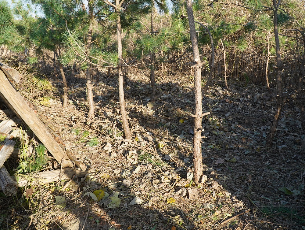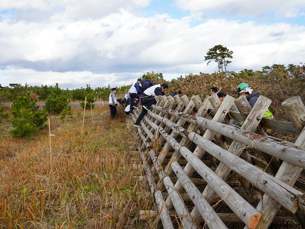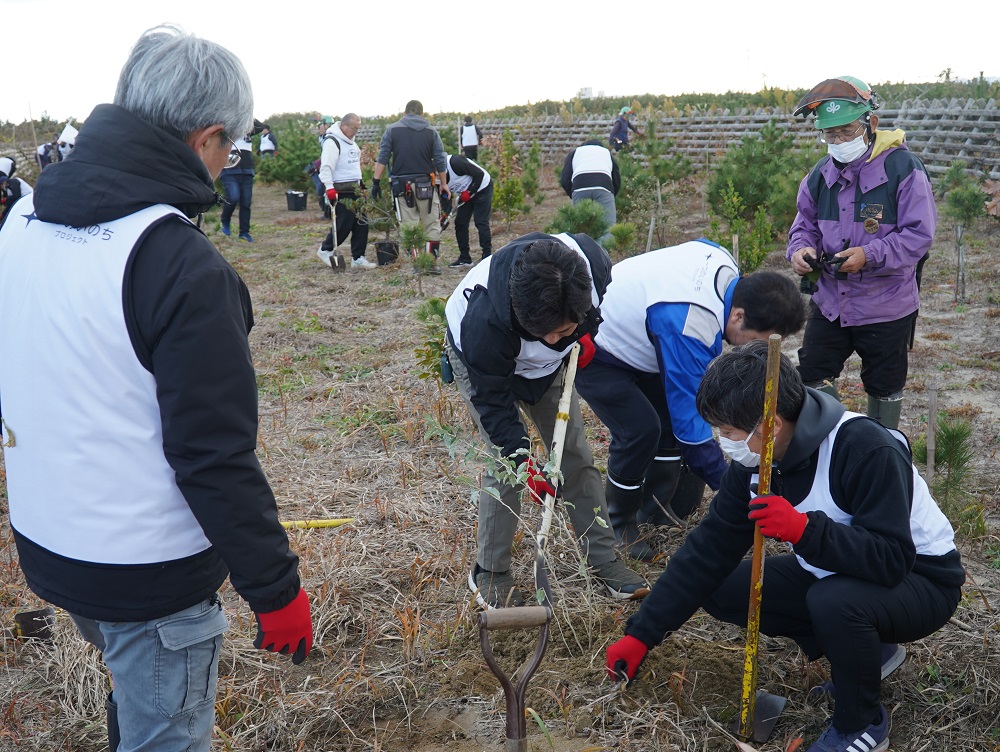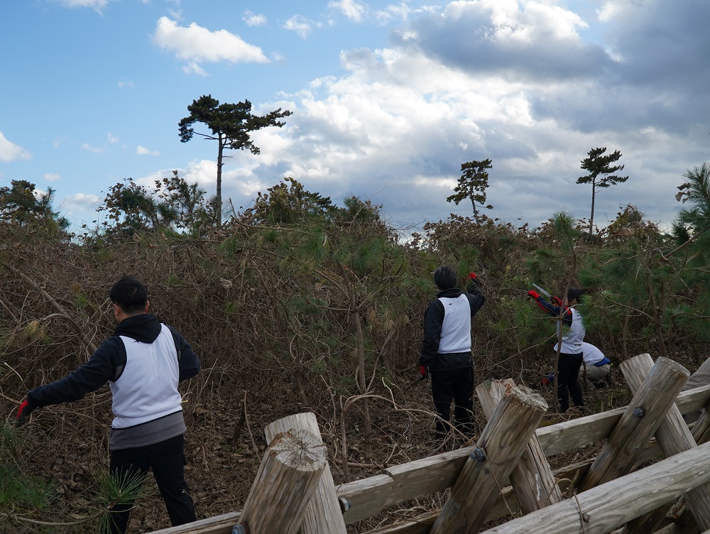 4チームに分かれインストラクターの方々から作業のコツや、除草対象の植物について説明を受けた後、クロマツに絡みつき生長を阻害する植物や雑草の除去を行った後は、新たな苗木の植樹を行いました。