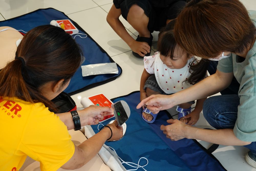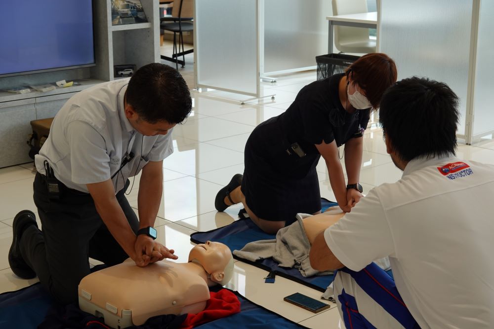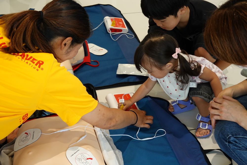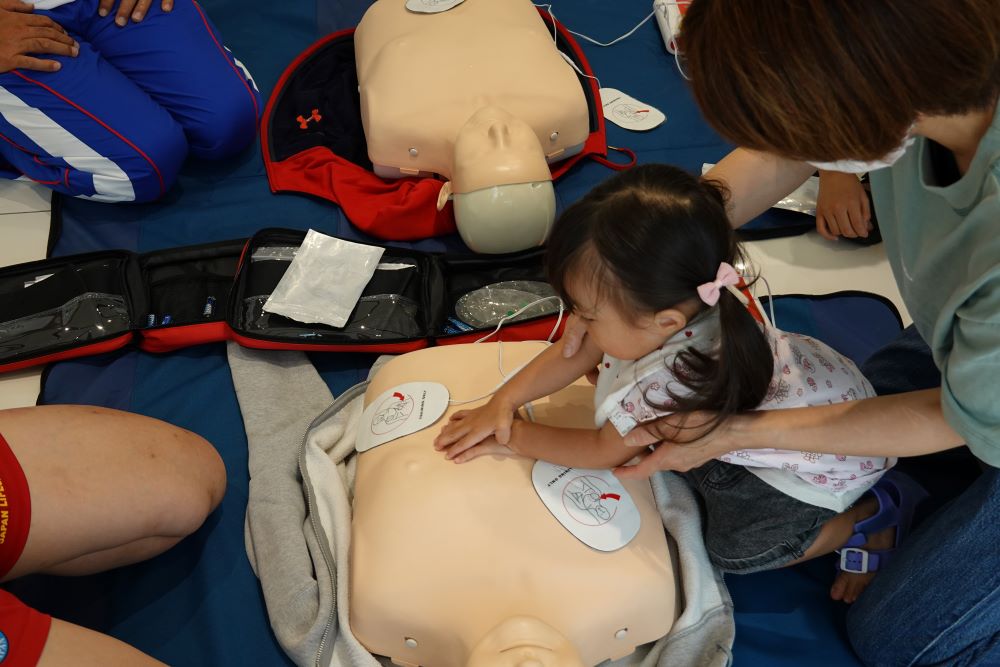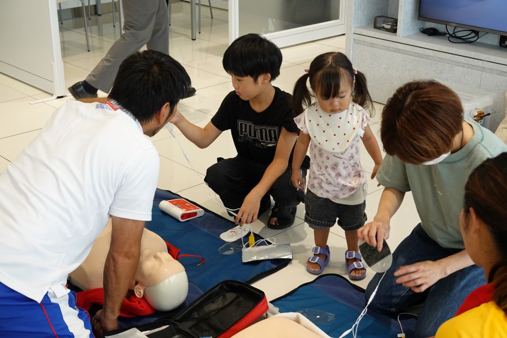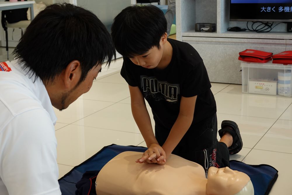 胸骨圧迫は、大人でも慣れていないと難しいため定期的に講習を受けたり振り返りが必要です。今回ご参加いただいた男性のお客様は「汗をかくほど結構大変でした」とおっしゃっていました。また、小さいお子様にも体験していただきました。胸骨圧迫は難しくとも、緊急時は周りにいる大人を呼んだり、助けを求めたりする必要性を学んでいました。