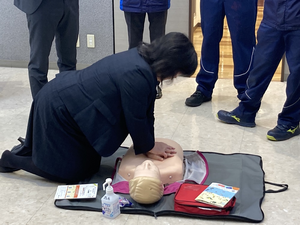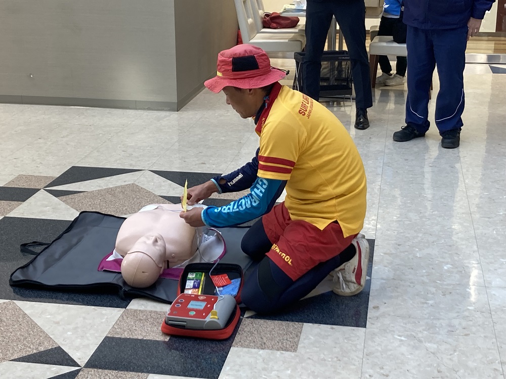 倒れている方を発見した際の周囲への呼びかけから、胸骨圧迫(心臓マッサージ)、そしてAEDの使用手順まで、一連の流れをスタッフ全員で体験しました。