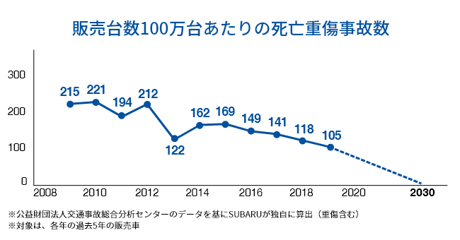 ※SUBARU車乗車中の死亡事故およびSUBARU車との衝突による歩行者・自転車等の死亡事故ゼロを目指す。